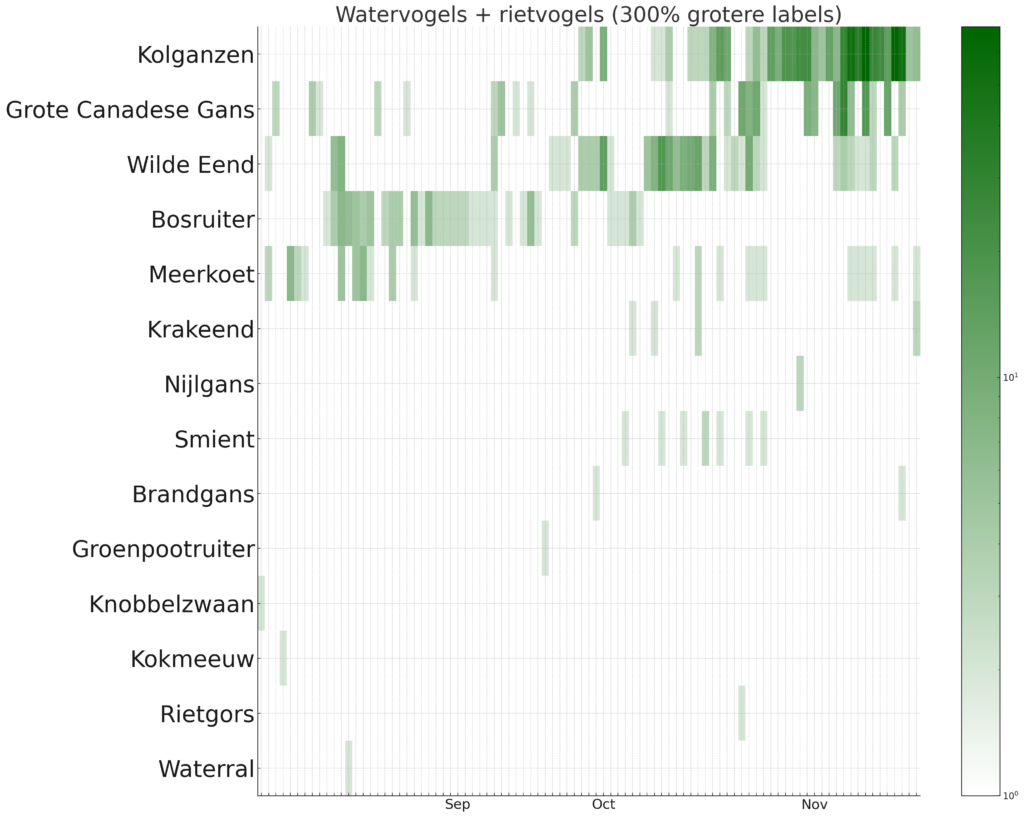 • Water- en rietvogels zijn het sterkst vertegenwoordigd, met duidelijke seizoensopbouw.