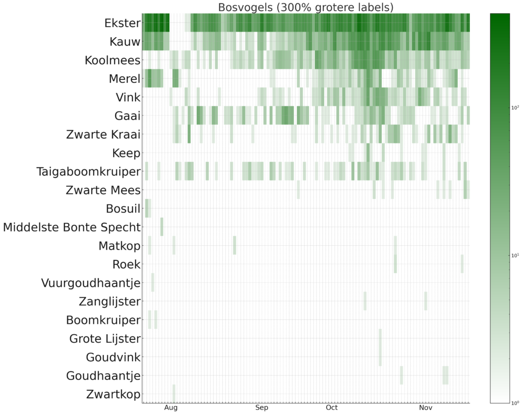 De bosvogelgroep vormt het meest stabiele en continue activiteitspatroon in de dataset. Hoewel de Eemerwaard geen klassiek bos bevat, is er voldoende structuur — rietranden, struweel, ruigte, knotwilgjes, oevervegetatie — om bosvogels jaar rond te dragen.