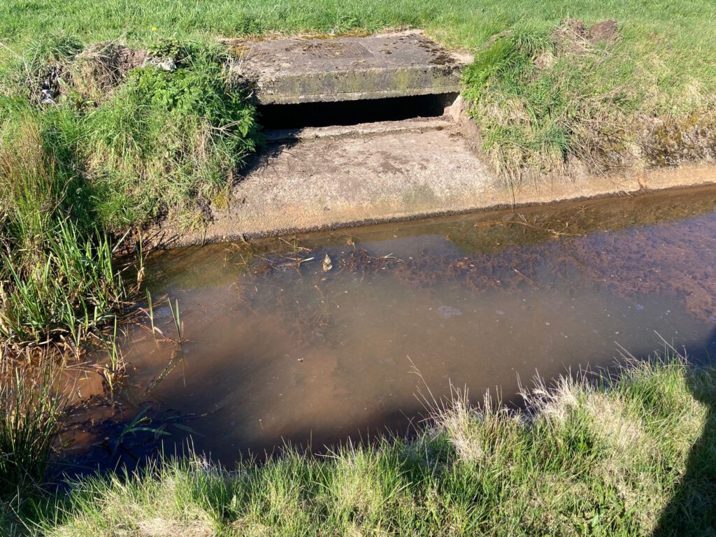 Als de pomp het aanbod niet aankan, loopt overtollig rioolwater via een buis van ongeveer 500 meter (Ø 50 cm) de sloot in.