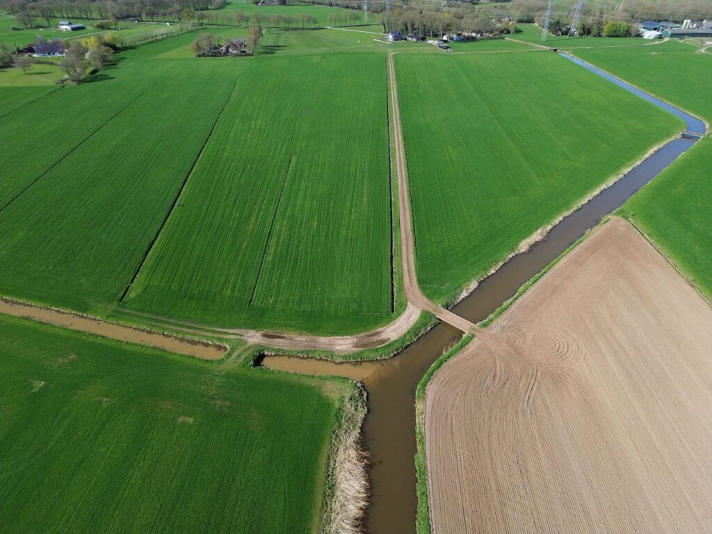 Met een drone zagen we vanuit de lucht een opvallende verkleuring in het water: lichtbruin, duidelijk anders dan de normale uitspoeling van het veenweidegebied.